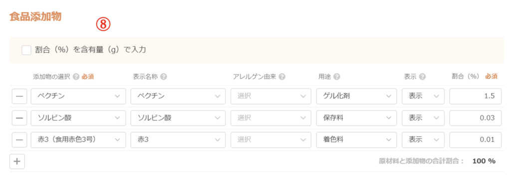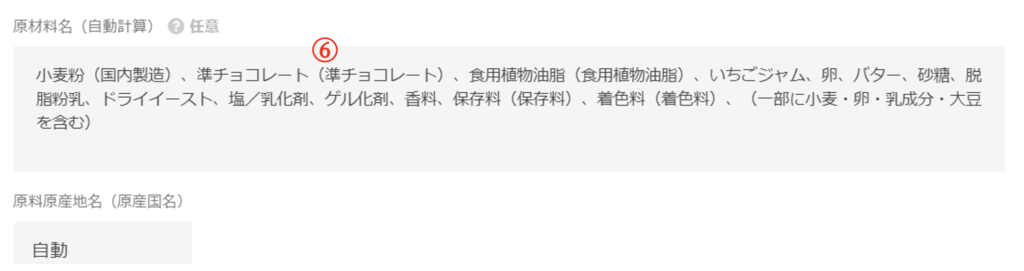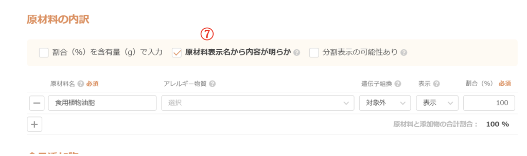 ・カッコの内容を正しく記載するためには「原材料表示名から内容が明らか」にチェックを付けるべきだったようです。(画像⑦)
