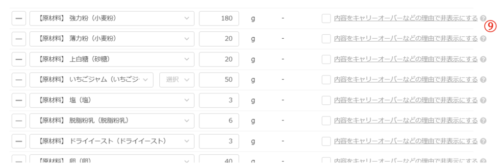 ・添加物のキャリーオーバーに関してはツール上においても各々の判断となるようです。キャリーオーバーに関する知識がない場合、対応が出来ず、全て記載するという選択しか出来ない状況になります。(画像⑨)